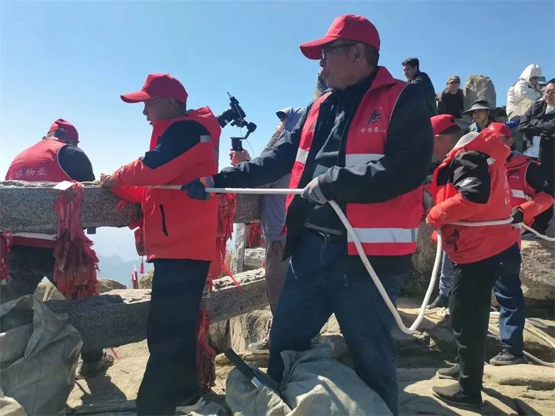 “一定要注意安全”“把繩子再往下放一點(diǎn)”“再往左一點(diǎn)”……10月3日的泰山之巔,瞻魯臺(tái)處的崖壁上,身穿紅馬甲的環(huán)衛(wèi)工人們正有條不紊地進(jìn)行他們?nèi)粘5膽已滦l(wèi)生清潔工作。這種在懸崖上作業(yè)的工作對(duì)于很多人來說陌生又驚險(xiǎn),但對(duì)這群被稱作“泰山美容師”的環(huán)衛(wèi)工來說,只是日常工作。假期泰山游客增多,隨之而來的產(chǎn)生的垃圾量也增多,尤其是懸崖峭壁處的垃圾,需要及時(shí)清理。在溝壑、山坡較多的地方,不方便行走怎么辦?泰山環(huán)衛(wèi)工的選擇是“像蜘蛛俠一樣爬”。“垃圾如果清理不及時(shí),天氣炎熱時(shí)導(dǎo)致食品類垃圾變質(zhì),會(huì)產(chǎn)生難聞的氣味和污染山頂環(huán)境,影響游客的旅游體驗(yàn)!碧┥轿穆眉瘓F(tuán)物業(yè)公司南天門片區(qū)經(jīng)理趙興忠告訴記者,日常平均一周需要到拱北石、瞻魯臺(tái)、獅子峰、天街等處懸崖?lián)焓扒謇砝鴥纱,一次撿拾垃圾兩袋或三袋。假日期間,“蜘蛛俠”們一天需要下懸崖兩次,清理懸崖死角垃圾時(shí)要下懸崖兩個(gè)人,撿拾垃圾10袋,小點(diǎn)的點(diǎn)位,下懸崖一次一個(gè)小時(shí),大點(diǎn)的熱門區(qū)域死角清理一次則需要3個(gè)小時(shí)。