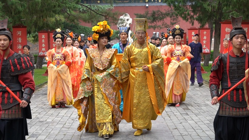 本次文化旅游節(jié)活動自10月1日持續(xù)至10月5日,活動期間設(shè)置了主題鮮明、層次豐富的特色內(nèi)容。每日10時(shí),來自中華泰山·封禪大典的演藝團(tuán)隊(duì)以《萬國來朝·盛世啟市》主題演出拉開序幕。天鼓初鳴之際,悠遠(yuǎn)號角與鏗鏘鼓點(diǎn)交織共鳴,依次呈現(xiàn)開場迎賓禮、司禮官肅穆登場、舞姬書生伴唐宮人物(李治、武則天)盛裝巡游。巡游結(jié)束后,演員們將化身隱藏NPC,身著唐宮華服扮演“帝王”“貴妃”等角色,與游客展開對詩猜謎、合影互動等環(huán)節(jié)